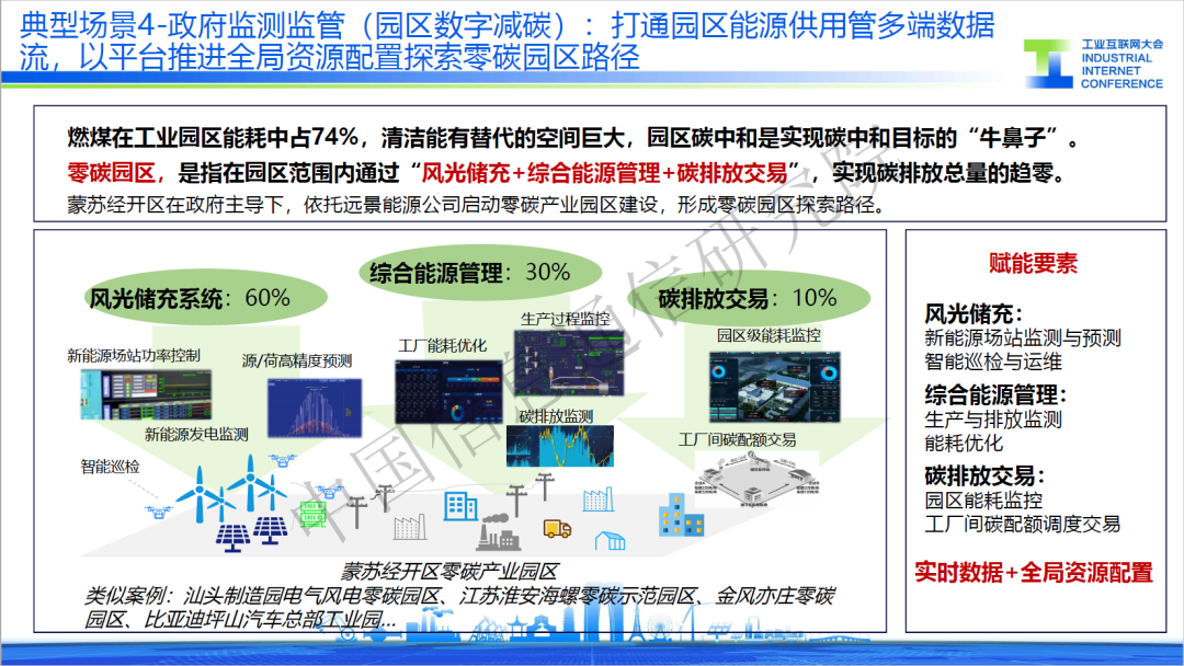 四是園區數字減碳,某產業園區通過“風光儲充+綜合能源管理+碳排放交易”實現零碳園區建設。在發電端,通過數據建模優化,通過新能源發電監測、源網荷儲調度等方式,優化發電調度的效率;在用電端,通過工廠能耗優化、生產過程管控等方式直接減少生產中的碳排放;在監管端,提供碳監控、碳核驗、碳交易等服務,實現資源的全局配置。