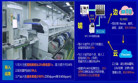 通過5G+AI構建機器視覺智能檢測,解決單機運算資源不足與云端計算網絡延時問題,實現端邊云協同毫秒級響應處理,提升檢測效率與品質,單日產出可增加24,000片,復判人力節省96人,不良漏失減少80%