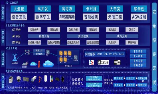 項目總體規劃部署服務工業互聯網的5G基站6個,邊緣計算(MEC)平臺1個,智慧綜合業務接入區1個,部署 5G 終端模組10套。充分利用現有平臺資源,構建多系統融合可擴展的DT(采集與邊緣處理平臺)AT(經驗知識模型平臺)OT(工業互聯網應用平臺) 三大平臺,實現5G網絡、終端能力調用及監測,具備百萬級以上規模終端的接入管理能力。