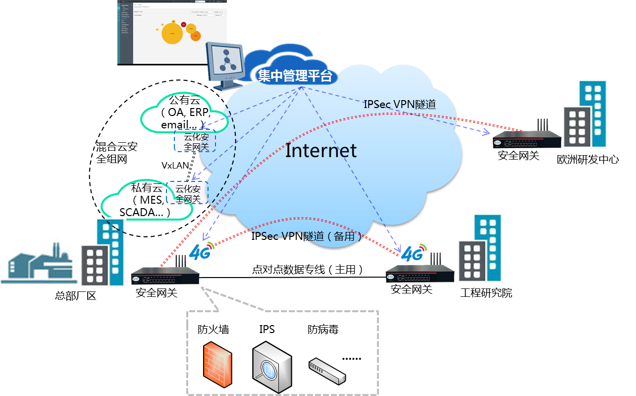 1、 企業總部廠區目前在進行智慧工廠改造,廠區內生產設備逐步聯入企業內網并將數據上傳至MES系統,一些敏感設備數據存在跨區域傳輸需要。企業現有的跨區域傳輸手段是租用運營商的傳輸專線,因此沒有建設接入互聯網所必須的防火墻、入侵保護等安全防護措施,難以實現工廠內網與工廠外網的隔離,也就無法保證生產運營數據的安全存儲和防止關鍵數據外泄。目前企業需要運用上述的安全措施在總部廠區,工程研究院和歐洲研發中心之間組建跨區域的工廠外網專網。