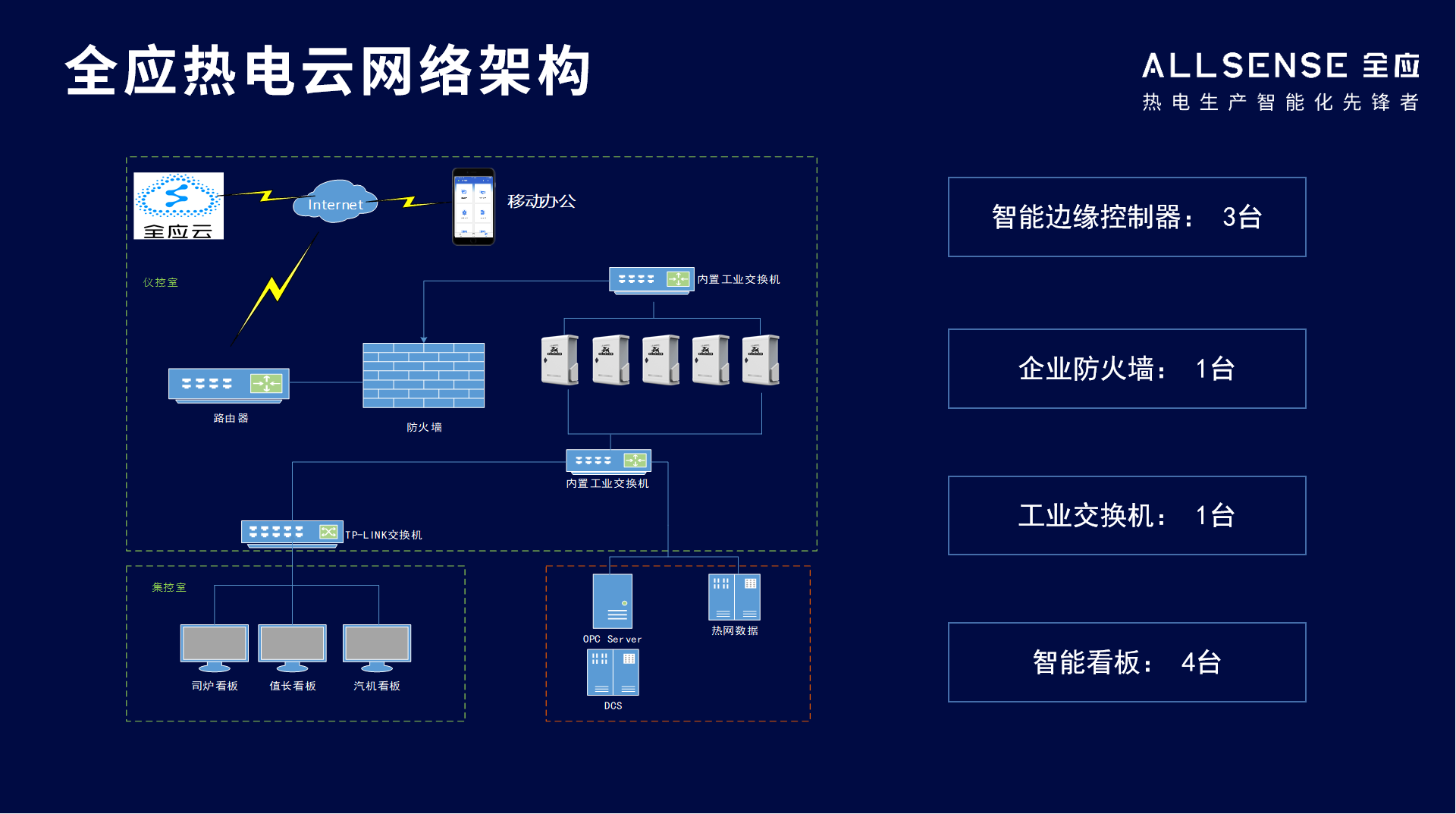 全應科技結合熱電廠實際情況,在熱電廠側共計部署智能邊緣控制器3臺,企業(yè)防火墻1臺,工業(yè)交換機1臺,智能看板4臺。既能提供熱電生產的智能化運行,又能確保熱電生產系統(tǒng)與外界隔離,確保熱電生產安全、穩(wěn)定運行。