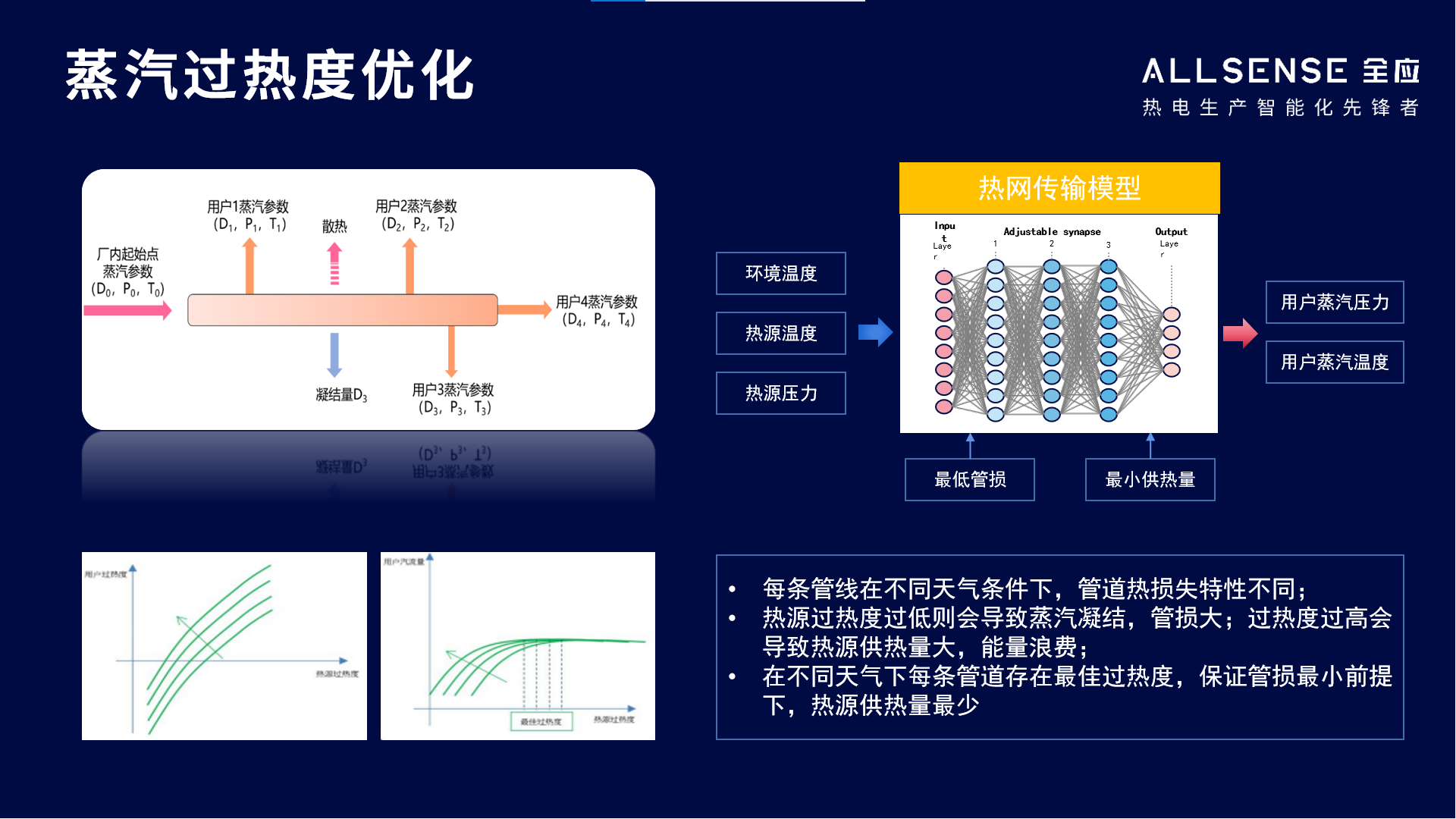 全應熱電云對整個供熱管網(wǎng)進行整體建模后,主要設計管道的壓降模型和供熱延遲模型,結合實際用戶端的實時流量數(shù)據(jù),預測下一個供熱時延周期,供熱管線入口處的熱負荷,協(xié)調鍋爐和汽機負荷。實際效果,可以降低供熱管線入口蒸汽溫度至265℃~272℃,即滿足消費端使用,又能提高整個熱電系統(tǒng)的能效水平。