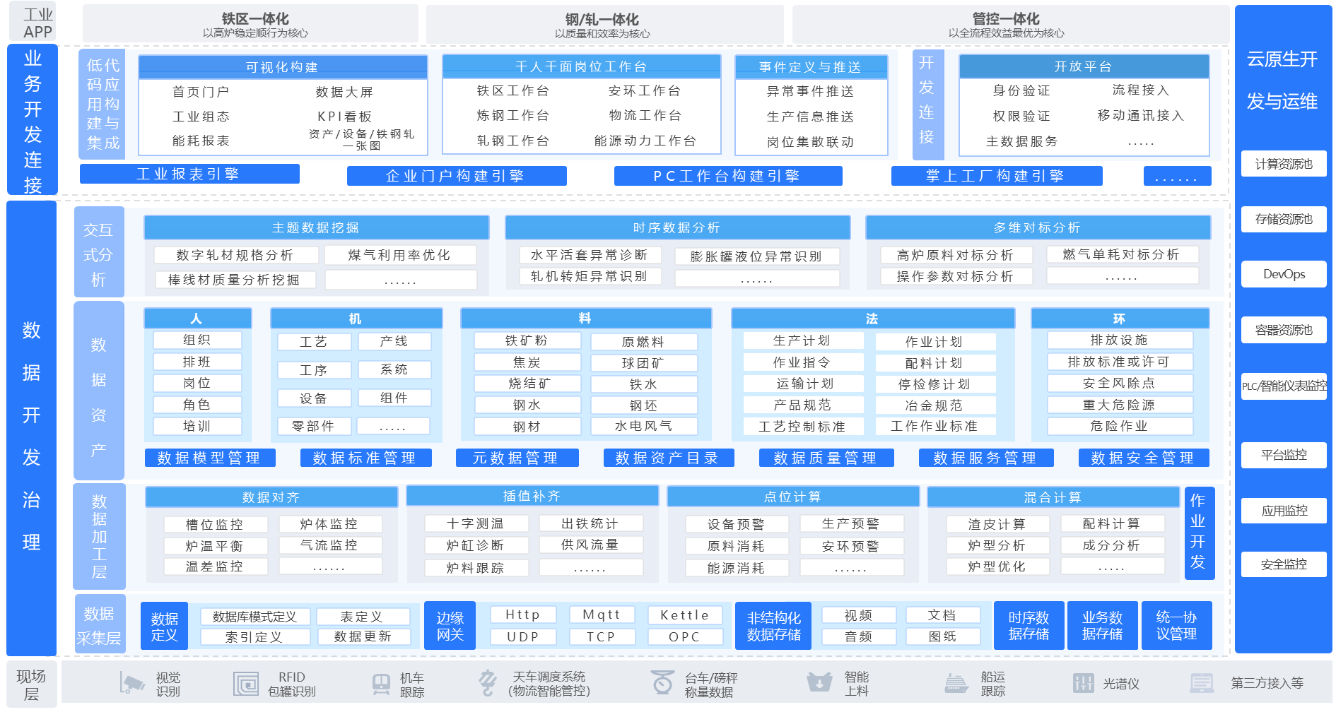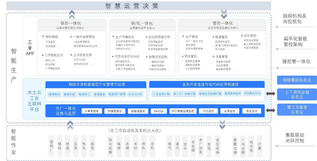 水土云工業(yè)互聯(lián)網(wǎng)平臺(tái)深度融合鋼鐵工藝知識(shí)和應(yīng)用場(chǎng)景,形成了“一個(gè)平臺(tái)+三個(gè)一體化”的新型鋼鐵行業(yè)智能制造架構(gòu),即以工業(yè)互聯(lián)網(wǎng)平臺(tái)為數(shù)字底座,以鐵區(qū)一體化、鋼軋一體化、管控一體化為思路,建設(shè)超大規(guī)模鋼鐵一體化智能管控應(yīng)用。整體解決方案基于鋼鐵行業(yè)特征,以私有云架構(gòu),向下連接生產(chǎn)車間自動(dòng)化系統(tǒng)以及智能傳感設(shè)備等,向上支撐全廠全流程生產(chǎn)管控業(yè)務(wù)。具體架構(gòu)如圖1所示。