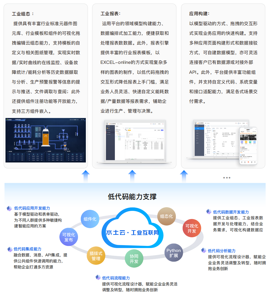 水土云工業(yè)互聯(lián)網(wǎng)平臺(tái)作為構(gòu)建數(shù)字工廠信息化框架和基礎(chǔ),主要由數(shù)據(jù)開發(fā)治理、業(yè)務(wù)開發(fā)連接、云原生開發(fā)運(yùn)維三大板塊組成,實(shí)現(xiàn)工業(yè)知識(shí)、模型和歷史數(shù)據(jù)的沉淀,并面向工業(yè)場(chǎng)景提供業(yè)務(wù)與數(shù)據(jù)的共享服務(wù)體系,降低企業(yè)IT的重復(fù)建設(shè)、減少煙囪式協(xié)作成本、敏捷響應(yīng)前端業(yè)務(wù)的快速變化。