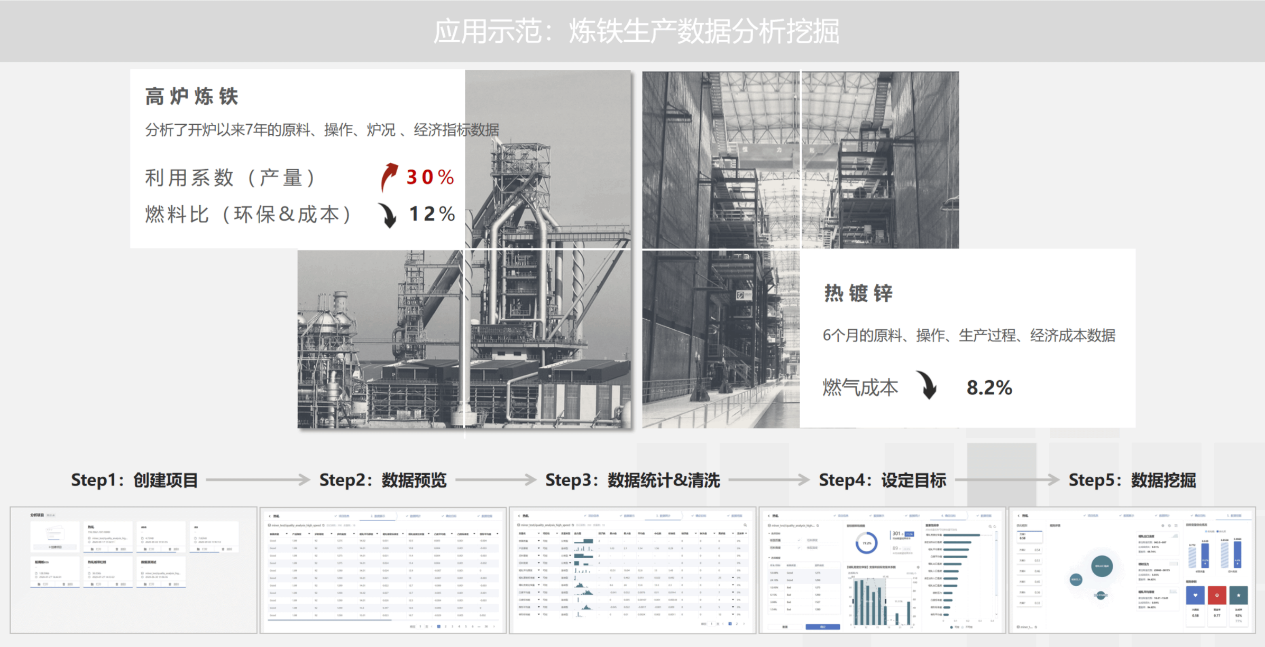 平臺(tái)在某鋼鐵企業(yè)煉鐵工序利用歷史數(shù)據(jù)輔助工藝人員優(yōu)化高爐爐況,分析鋼鐵企業(yè)5800m3開爐7年的原料、操作、爐況、經(jīng)濟(jì)指標(biāo)數(shù)據(jù),顯著提升利用系數(shù),降低燃料比,減少企業(yè)成本,實(shí)現(xiàn)節(jié)能減排。