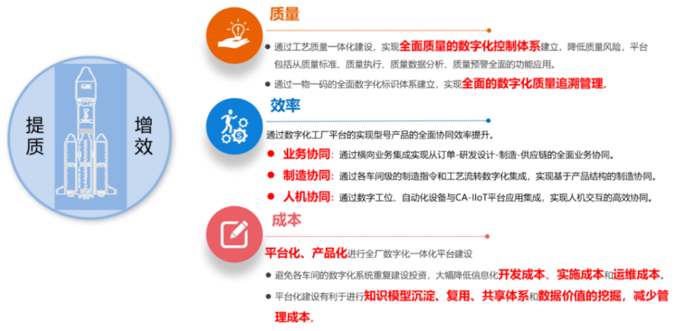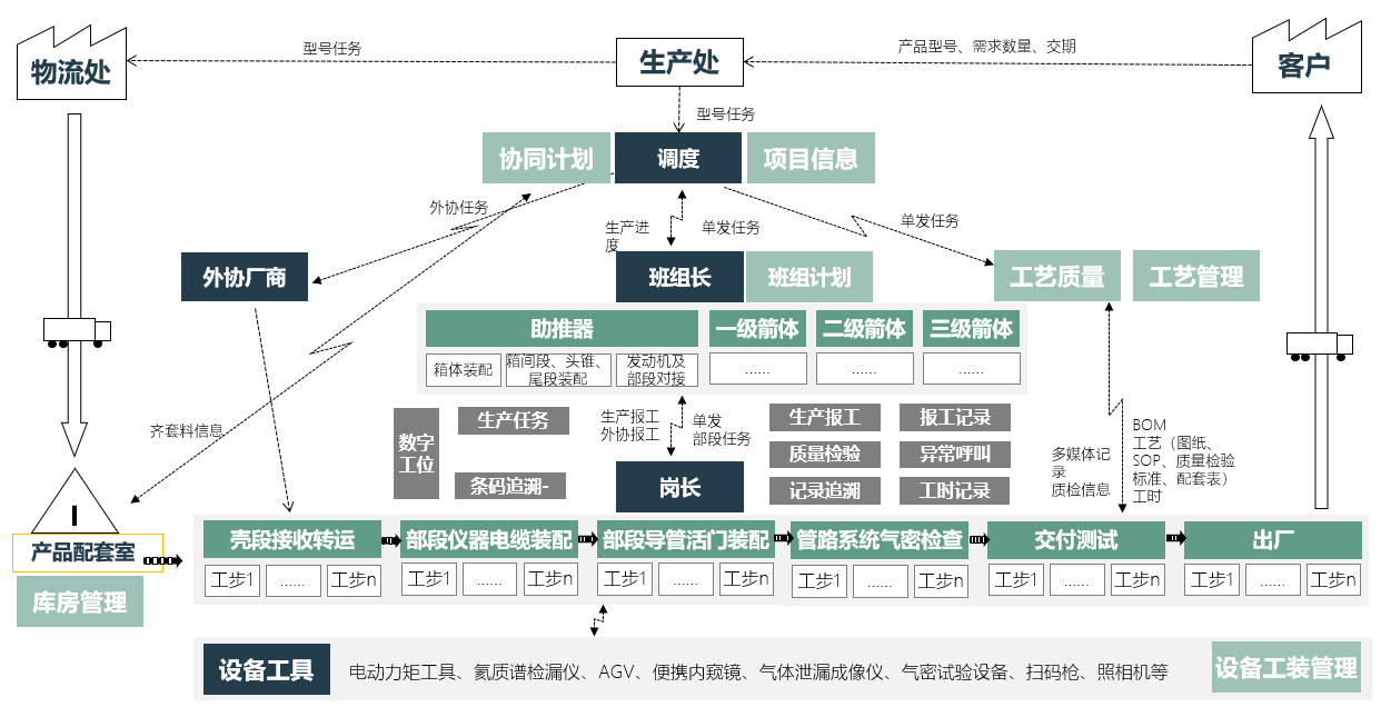 以數字化工廠平臺為基礎,以總裝為起點,向機加、輔助處理、部裝等制程輻射,實現航天裝備制造全業務流程、全價值鏈的數字化協同。
