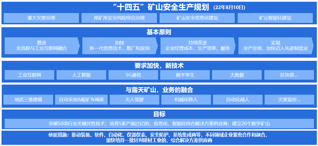 自2015年以來(lái),國(guó)家及地方出臺(tái)多部智能礦山建設(shè)政策、指導(dǎo)意見(jiàn)及行業(yè)規(guī)范,其中包含《中國(guó)制造2025》、《砂石行業(yè)綠色礦山建設(shè)規(guī)范》(DZ/T 0316-2018)、《水泥灰?guī)r綠色礦山建設(shè)規(guī)范》(DZ/T 0318-2018) 、《河南省非煤礦山智能化建設(shè)實(shí)施方案(試行)》等,支持并積極引導(dǎo)煤礦及非煤礦山向智能化發(fā)展,同時(shí),在科技、產(chǎn)業(yè)和金融等方面給與全方位支持。作為實(shí)現(xiàn)“雙碳”目標(biāo),助力礦山低碳、綠色發(fā)展的重要手段,政策明確推進(jìn)礦業(yè)領(lǐng)域科技創(chuàng)新,加快建設(shè)數(shù)字化、智能化、信息化、自動(dòng)化礦山,推進(jìn)節(jié)能減排,將智慧礦山建設(shè)提升到新的高度。