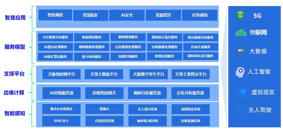 我們?nèi)诤?G、物聯(lián)網(wǎng)、大數(shù)據(jù)、人工智能、無(wú)人駕駛等前端主流技術(shù),通過(guò)天信工業(yè)互聯(lián)網(wǎng)平臺(tái)的物聯(lián)網(wǎng)平臺(tái)、大數(shù)據(jù)平臺(tái)、數(shù)字孿生平臺(tái)、工業(yè)算法平臺(tái)提供一系列服務(wù)模型,為智慧礦山頂層應(yīng)用提供服務(wù)支撐。