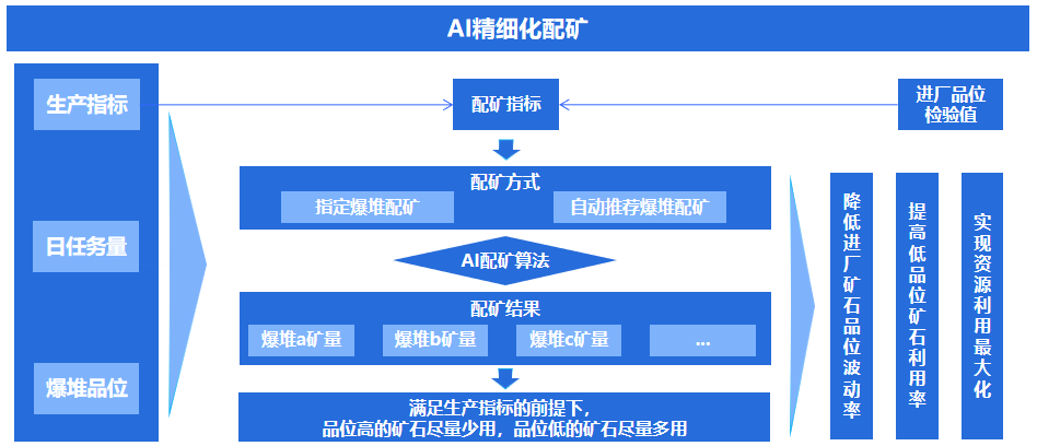智能配礦:自研AI配礦算法,滿(mǎn)足配礦指標(biāo)前提下,盡可能提高低品位礦石利用率,實(shí)現(xiàn)資源利用的最大化。