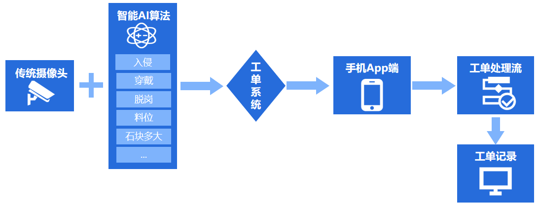 在原有監(jiān)控設(shè)備上部署 AI 識(shí)別算法,對(duì)高風(fēng)險(xiǎn)安全區(qū)域、重點(diǎn)生產(chǎn)區(qū)域進(jìn)行情景識(shí)別,可實(shí)現(xiàn)對(duì)入侵、穿戴、脫崗、煙塵、料位、石塊過(guò)大等事件的精準(zhǔn)識(shí)別,并與工單聯(lián)動(dòng),出現(xiàn)異常立即向相關(guān)人員手機(jī)端 App 推送工單,縮短響應(yīng)時(shí)間,實(shí)現(xiàn)安全管理的智能化。