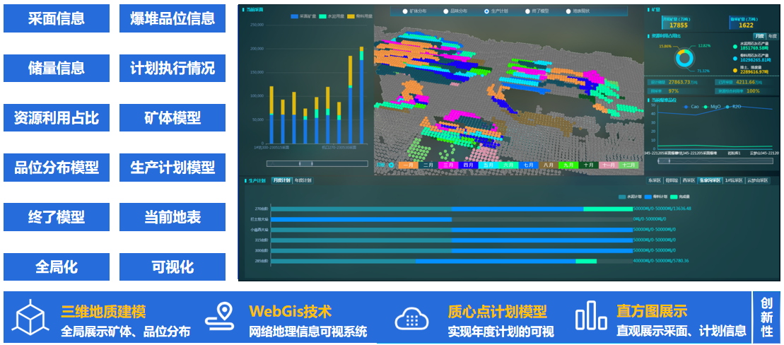 根據(jù)露天非金屬礦山企業(yè)的實(shí)際生產(chǎn)需求,結(jié)合行業(yè)痛點(diǎn),通過(guò)對(duì)礦山穿、爆、裝、運(yùn)、卸等各個(gè)生產(chǎn)環(huán)節(jié)長(zhǎng)期跟蹤調(diào)研,全流程收集分析生產(chǎn)數(shù)據(jù),采用信息化、數(shù)字化、智能化手段,對(duì)礦山資源開(kāi)采、生產(chǎn)計(jì)劃、爆破流程、車(chē)鏟調(diào)度、品位搭配、裝卸計(jì)量、安全管理等各個(gè)生產(chǎn)環(huán)節(jié)進(jìn)行流程優(yōu)化與管控,解決傳統(tǒng)礦山數(shù)字化程度低、生產(chǎn)數(shù)據(jù)遺失、業(yè)務(wù)環(huán)節(jié)分散不互通的難題,實(shí)現(xiàn)礦山資源開(kāi)采的數(shù)字化、安全生產(chǎn)的智能化以及智能管控的集成化。