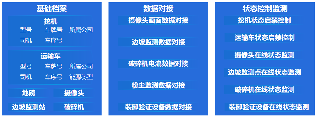 作為礦山生產(chǎn)及輔助生產(chǎn)設(shè)備的基礎(chǔ)檔案,如運(yùn)輸車(chē)、挖機(jī)、破碎機(jī)、攝像頭、邊坡檢測(cè)點(diǎn)、裝卸驗(yàn)證設(shè)備等,通過(guò)接口對(duì)接可實(shí)時(shí)展示設(shè)備的運(yùn)行狀態(tài),并與工單聯(lián)動(dòng),出現(xiàn)異常立即向相關(guān)人員手機(jī)端 App 推送工單。