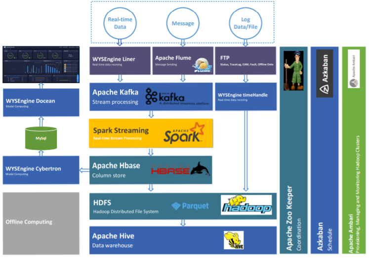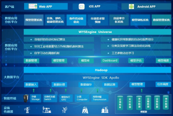 智能終端做為智擎工業(yè)設備數(shù)據(jù)采集運算終端,可以與設備PLC 通信,把傳感器的實時數(shù)據(jù),錄波數(shù)據(jù)采集出來,并且作為端的運算終端,針對實時的數(shù)據(jù)進行初步的運算,然后進行大數(shù)據(jù)平臺的數(shù)據(jù)接入,可以支持數(shù)據(jù)的斷點續(xù)傳。WYSEngine SDK Apollo 作為產(chǎn)品數(shù)據(jù)接口的 SDK 組件,運行與 Hadoop 大數(shù)據(jù)平臺執(zhí)行,按照工業(yè)設備的數(shù)據(jù)應用場景進行功能組件的封裝,實現(xiàn)從數(shù)據(jù)的接入、數(shù)據(jù)處理、數(shù)據(jù)存儲、數(shù)據(jù)運算、模型管理和任務調(diào)度等功能,為上層應用提供平臺級的支撐。
