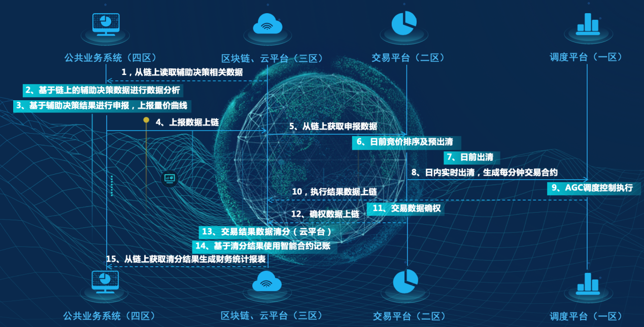 我們將區塊鏈技術引入新能源輔助服務交易,搭建了以省電力調控中心為盟主的共享儲能調峰市場交易聯盟鏈,著力解決儲能調峰交易結果數據存證、智能合約清分結算和財務通證記賬以及電費資產證券化的問題,提升市場交易的公信力。