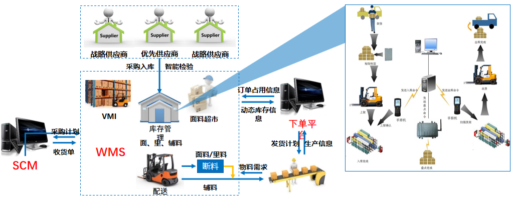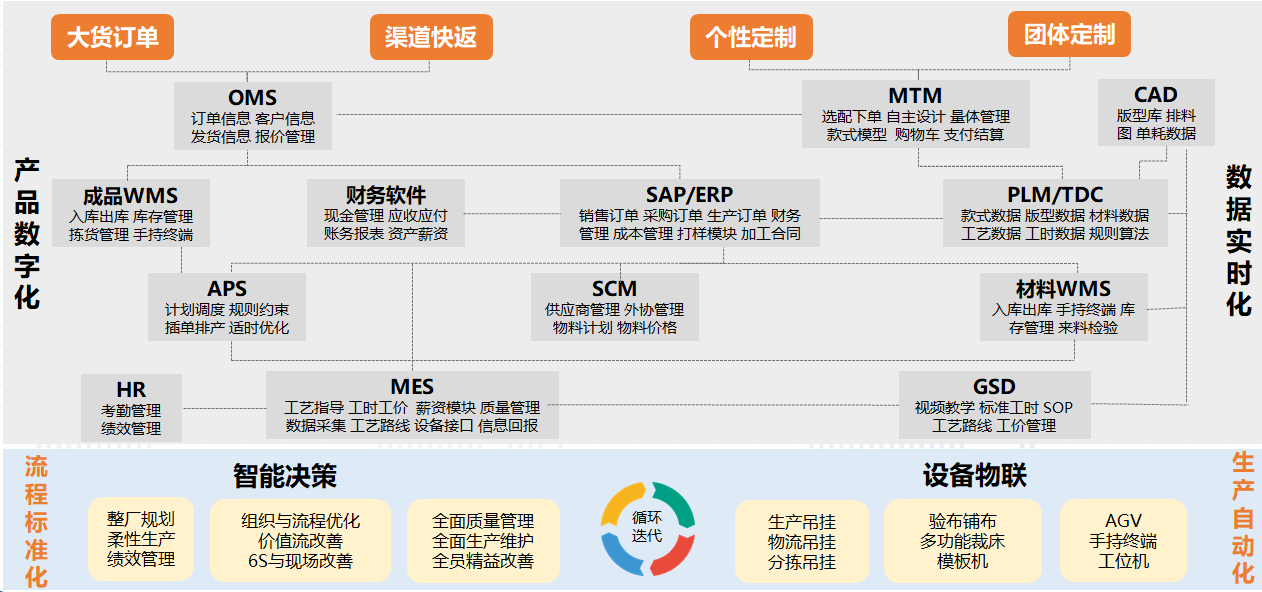 海思堡項目通過產(chǎn)品數(shù)字化及數(shù)據(jù)實時化,通過OMS定制下單系統(tǒng),輔助AI量體,實現(xiàn)用戶個性化定制下單,由TDC技術(shù)數(shù)據(jù)中心實現(xiàn)工藝、版型等的自動處理,并通過CAD實現(xiàn)版型生成。SCM與WMS系統(tǒng),實現(xiàn)供應(yīng)商高效協(xié)同與物料精準(zhǔn)管理,由APS高效排產(chǎn),MES信息化驅(qū)動裁剪、縫制、后整、包裝全生產(chǎn)過程,成品WMS及TMS對接,實現(xiàn)成品的高效管理及實時追蹤。基于上述的全流程信息化方案,同時,對接鋪布、視覺檢測、裁剪、吊掛、AGV、分揀、亮燈、手持機(jī)等自動化設(shè)備和應(yīng)用,實現(xiàn)大規(guī)模個性化定制的服裝智能制造解決方案。