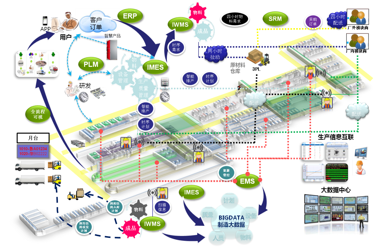 沈陽冰箱智能互聯(lián)工廠架構(gòu)的核心是智能制造執(zhí)行 iMES 系統(tǒng),通過iMES驅(qū)動ERP、Logitics、PLM(包含CAD/CAPP/設計仿真、制造仿真)、Control(生產(chǎn)數(shù)據(jù)采集分析等)五大系統(tǒng)集成;業(yè)務上通過智能的制造,把制造、研發(fā)、物流緊密的互聯(lián)互通。通過智能制造執(zhí)行系統(tǒng)和現(xiàn)場智能化硬件的連接,構(gòu)建了一個高度靈活的個性化和數(shù)字化制造模式,逐步實現(xiàn)從管理、研發(fā)、生產(chǎn)、物流的數(shù)字化管理,提升企業(yè)全系統(tǒng)、全業(yè)務的智能化水平。