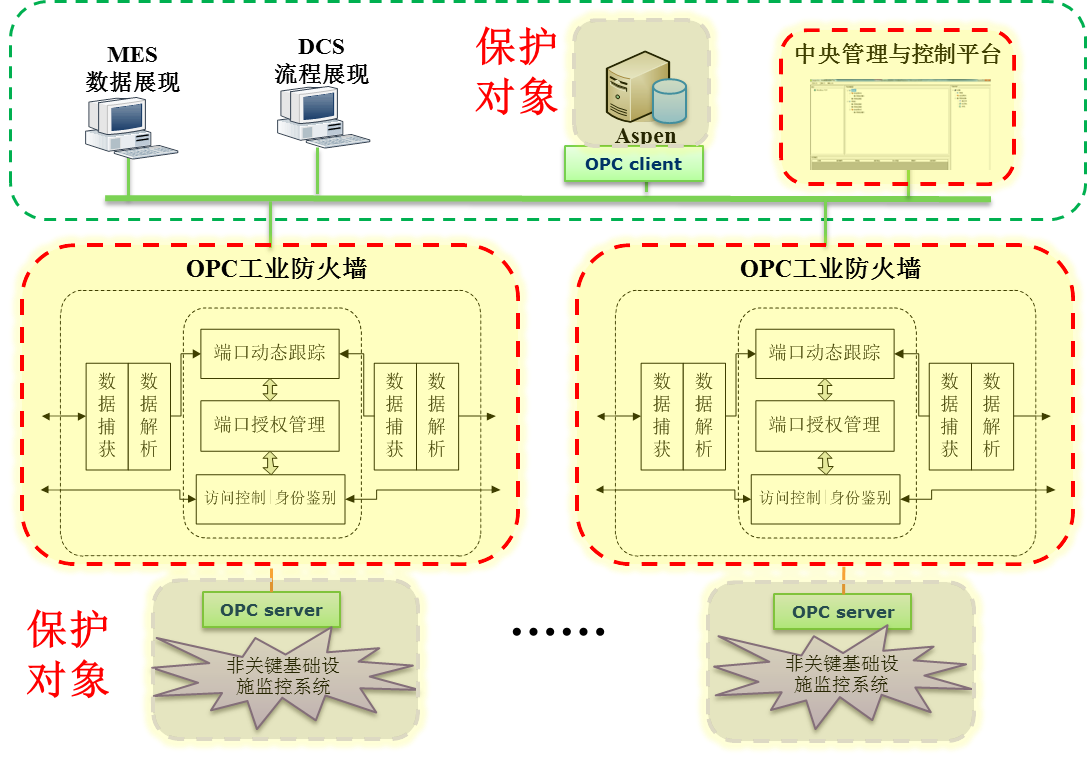 新興鑄管廠的OPC工業(yè)防火墻安全防護(hù)的總體架構(gòu)如圖所示,OPC工業(yè)防火墻保護(hù)每個(gè)控制系統(tǒng)區(qū)域,部署在控制系統(tǒng)區(qū)域出口,進(jìn)行區(qū)域隔離,避免病毒擴(kuò)散,對(duì)OPC協(xié)議進(jìn)行解析、動(dòng)態(tài)端口管理、完整性檢查等,避免病毒攻擊。安全管控平臺(tái)為統(tǒng)一的集中管理OPC工業(yè)防火墻,部署在同Aspen數(shù)據(jù)庫同一層,對(duì)整個(gè)工業(yè)智能控制網(wǎng)絡(luò)進(jìn)行實(shí)時(shí)監(jiān)控,對(duì)報(bào)警及消息日志進(jìn)行歷史存儲(chǔ)與分析。