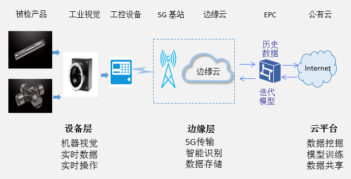 基于5G和人工智能技術的產品質量實時檢測和優化方案通過機器視覺、5G蜂窩無線、人工智能、邊緣計算等技術結合,實現了產品質量的實時高精度檢測,通過工業云平臺實現檢測模型的迭代提高和共享。