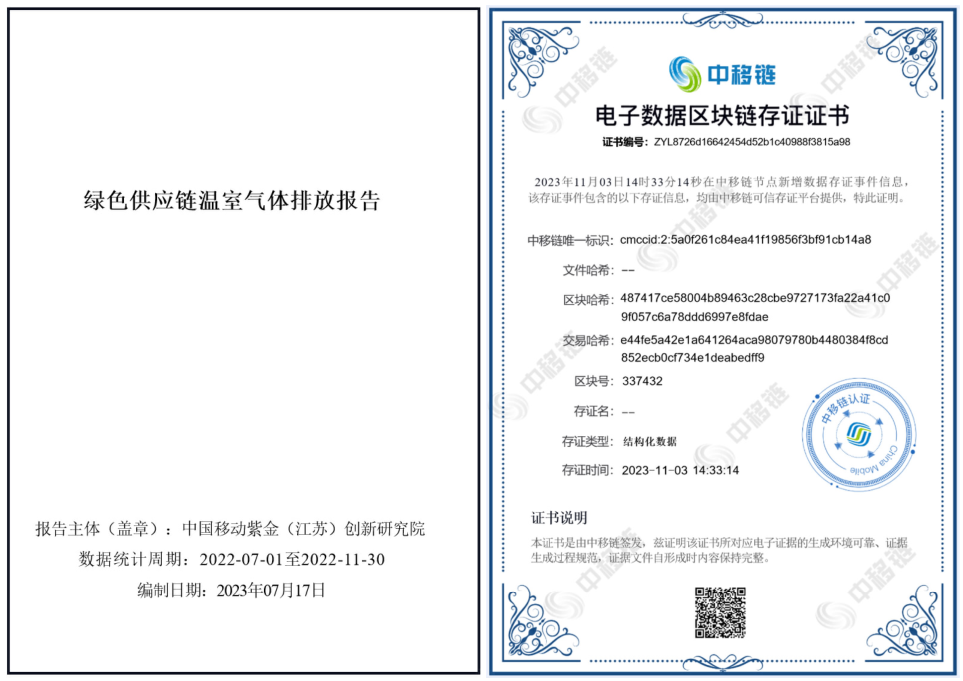 同時,本文所述綠色供應鏈系統內置國家標準碳排因子庫及碳核算公式模板庫,根據不同場景下碳排放活動數據差異,自動匹配相關智能合約進行碳核算,核算過程不受人為干預,核算步驟嚴格按照國家標準,確保公開可信,相關核算過程集體維護并記錄在鏈。如圖6所示,對于相關核算結果,本平臺會自動出具碳排放報告及存證證書,保證碳計算過程公開透明、安全可信,計算結果不可篡改。