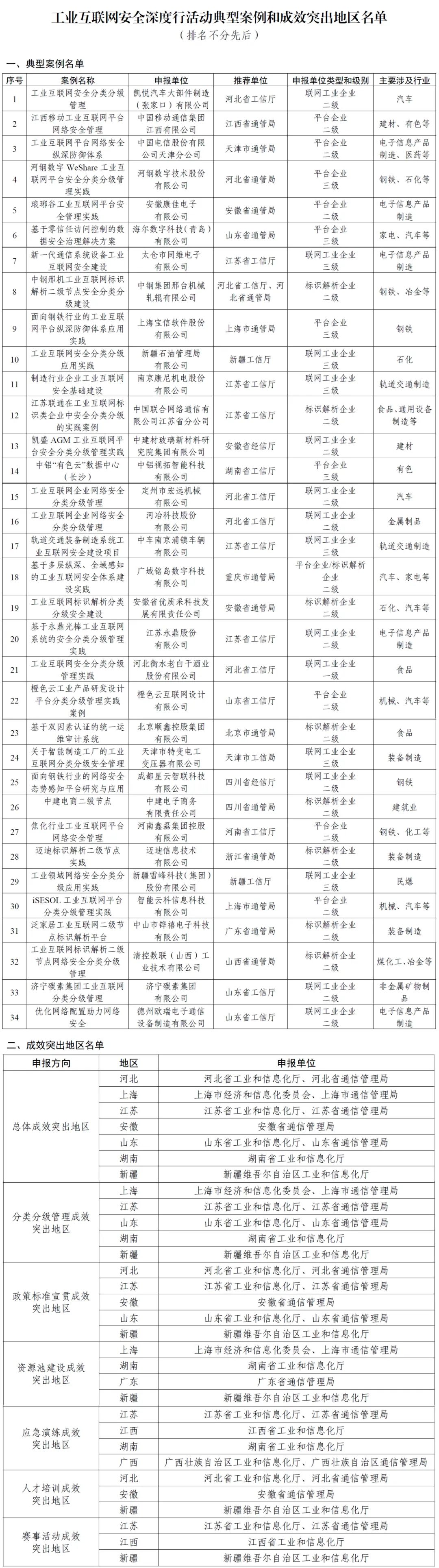 關于公布工業互聯網安全深度行活動典型案例和成效突出地區名單的通知