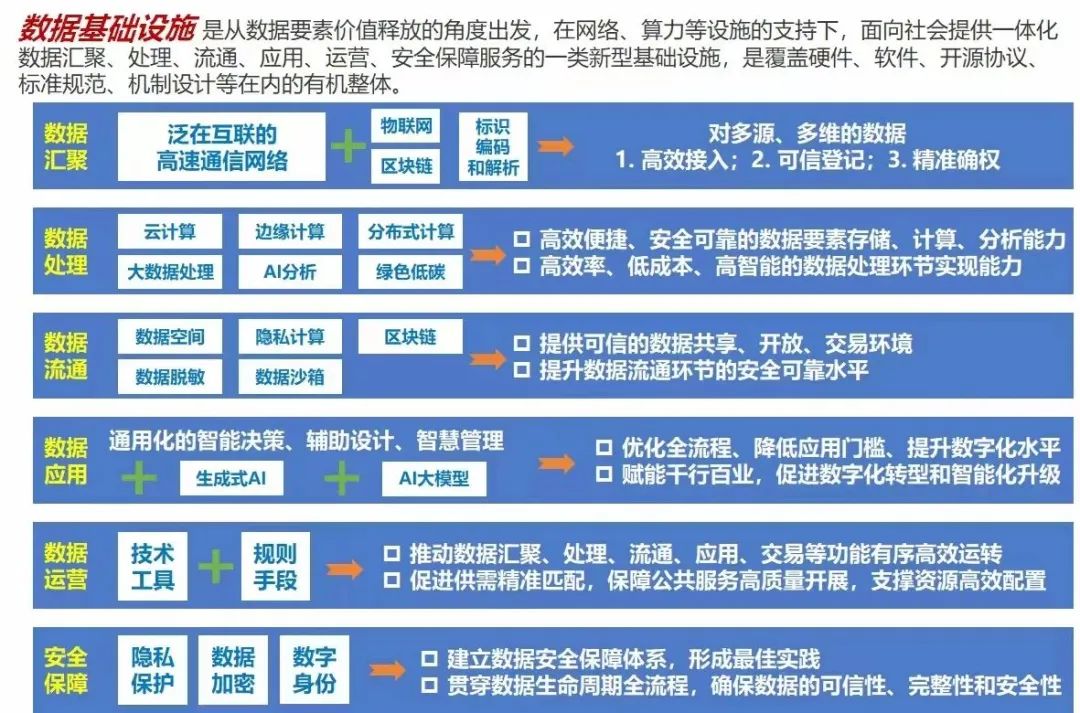 劉烈宏指出,數(shù)據(jù)基礎(chǔ)設(shè)施是從數(shù)據(jù)要素價(jià)值釋放的角度出發(fā),在網(wǎng)絡(luò)、算力等設(shè)施的支持下,面向社會(huì)提供一體化數(shù)據(jù)匯聚、處理、流通、應(yīng)用、運(yùn)營、安全保障服務(wù)的一類新型基礎(chǔ)設(shè)施,是覆蓋硬件、軟件、開源協(xié)議、標(biāo)準(zhǔn)規(guī)范、機(jī)制設(shè)計(jì)等在內(nèi)的有機(jī)整體。
