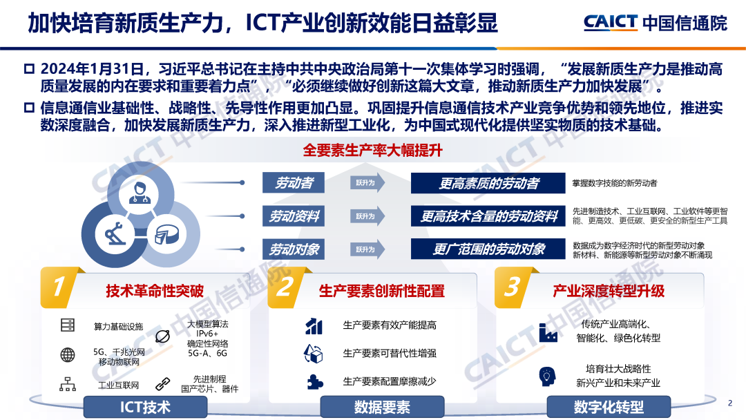 發展新質生產力是推動高質量發展的內在要求和重要著力點。ICT 產業通過強化技術創新突破、優化生產要素配置、賦能產業轉型升級等,推動顛覆性技術加速涌現、提高資源配置效率、帶動傳統產業全方位系統性變革,為新質生產力培育注入源源不竭的動力,已成為推動傳統生產力質態躍遷、促進全要素生產率大幅提升、實現高質量發展的重要動力來源。