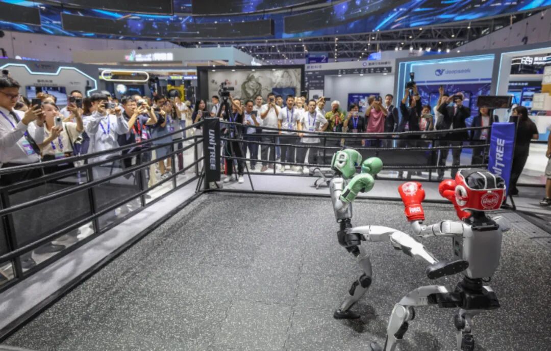 在第四屆全球數字貿易博覽會數智未來主題展區的杭州六小龍專區,宇樹科技的人形機器人在進行格斗擂臺賽。新華社記者  徐昱攝
