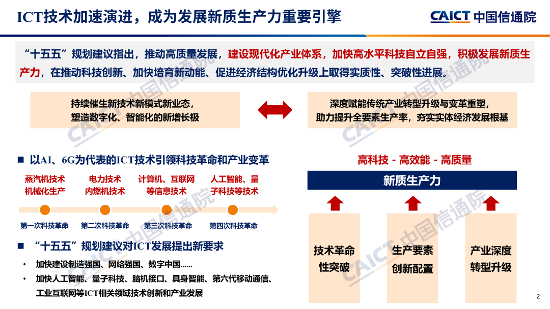 “十五五”規劃建議提出,推動高質量發展,建設現代化產業體系,加快高水平科技自立自強,積極發展新質生產力。以人工智能為代表的新一代信息通信技術正在引領新一輪科技革命和產業變革,日益成為培育發展新質生產力、推進中國式現代化、實現高質量發展的關鍵支撐。中國信通院研判認為,面向“十五五”,ICT產業正在進入以智能化重構為驅動的新增長周期,人工智能技術產業應用協同創新,將驅動通信、感知和計算等信息基礎設施迭代升級,推動智能終端、智能服務等軟硬件協同創新,促進智能安全體系變革重塑;數字化轉型向縱深推進,智能技術全面融入,推動生產要素創新性配置,深度賦能傳統產業轉型升級和變革重塑,助力提升全要素生產率;國內數字治理體系建設縱深推進,中國將以更加積極主動姿態參與全球數字治理。