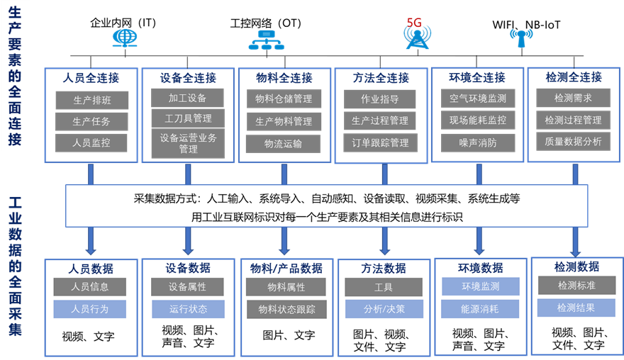 圖7 5G全連接工廠人、機、料、法、環、測等數據采集內容示例