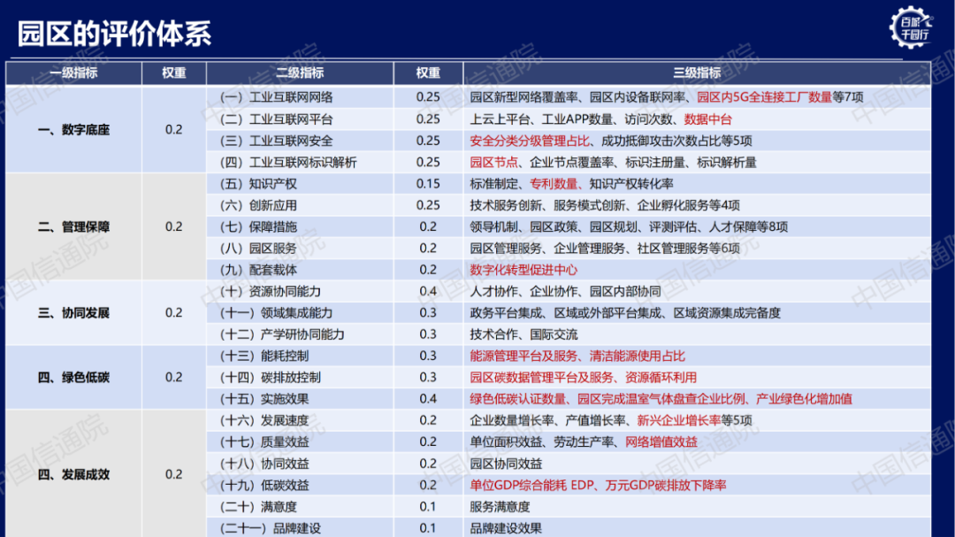 工業(yè)互聯(lián)網(wǎng)園區(qū)評價指標(biāo)體系通過科學(xué)的方法,分別從數(shù)字底座、管理與服務(wù)、協(xié)同發(fā)展、綠色低碳、發(fā)展成效5個要素作為評價的一級指標(biāo),并對各項一級指標(biāo)進行細化,形成工業(yè)互聯(lián)網(wǎng)網(wǎng)絡(luò)、工業(yè)互聯(lián)網(wǎng)標(biāo)識解析等21項二級指標(biāo),69項三級指標(biāo)的綜合評估體系。