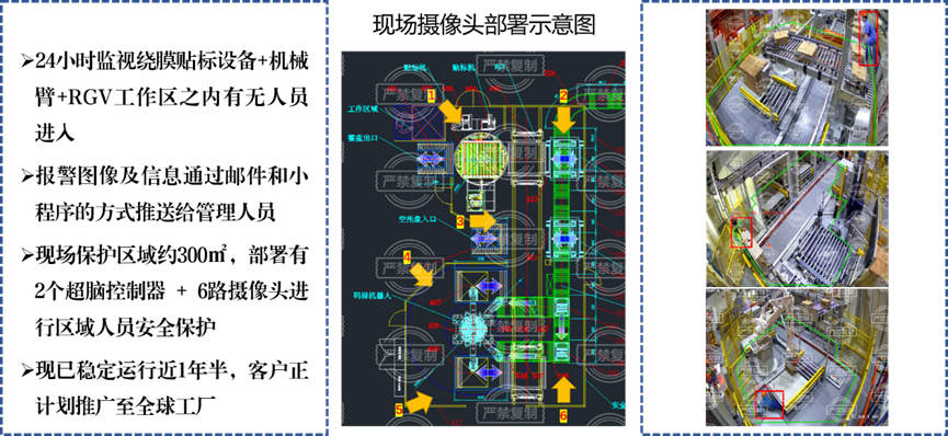 該工廠實際生產區域占地300平方米,現場共部署了2套YobiAI工業安全眼。每套系統均由一臺YobiAI EdgeX智能超腦控制器和3路攝像頭組成。當有人員進入監測范圍時,工業安全眼會及時檢測到并立即停止機械臂的工作。此外,現場拍攝到的圖片還將通過郵件和小程序等方式發送給管理人員,讓其能夠更好地進行工廠的安全管理。