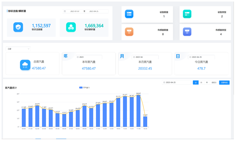 針對(duì)該園區(qū)蒸汽使用的情況,為每一臺(tái)蒸汽鍋爐安裝蒸汽流量傳感器和邊緣智傳網(wǎng)關(guān),在蒸汽使用的廠房入口的位置也同樣部署傳感器和網(wǎng)關(guān),結(jié)合自主開(kāi)發(fā)的IoT能源監(jiān)測(cè)管理平臺(tái),對(duì)軟硬件進(jìn)行了快速的部署,實(shí)現(xiàn)了全園區(qū)蒸汽生產(chǎn)與使用的在線監(jiān)管,精準(zhǔn)實(shí)現(xiàn)了蒸汽生產(chǎn)量、使用量、使用率、損失率、能源利用率等數(shù)據(jù)的統(tǒng)計(jì)。