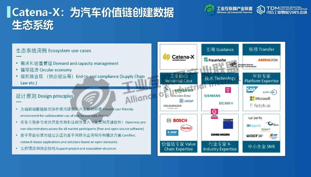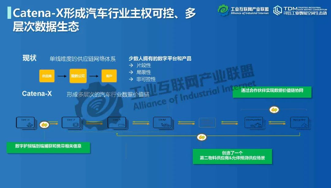 本期為您帶來由德國弗勞恩霍夫協會中國代表處代表楊雯帶來的《國際視野:Catena-X數據空間在汽車領域落地》。介紹了歐洲對數據空間的需求和定義,數據空間標準化、生態發展情況,以及德國弗勞恩霍夫協會與中國信息通信研究院在數據空間領域開展的深入合作。Catena-X旨在形成汽車行業主權可控多層次數據生態,為汽車價值鏈創建數據生態系統,構建全球汽車行業全價值鏈數據生態合作的宏大愿景。