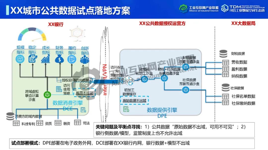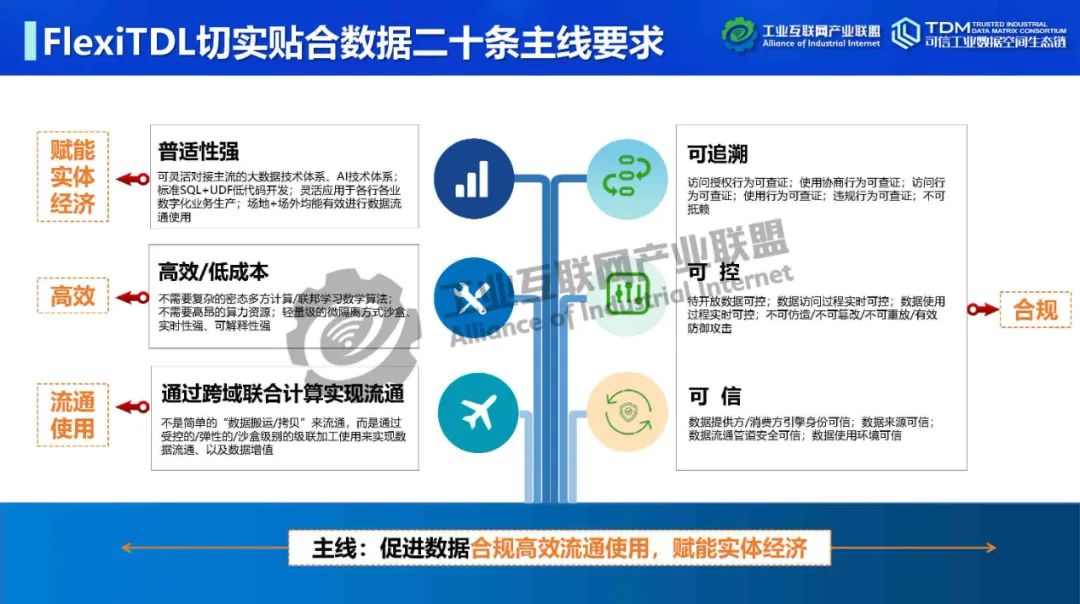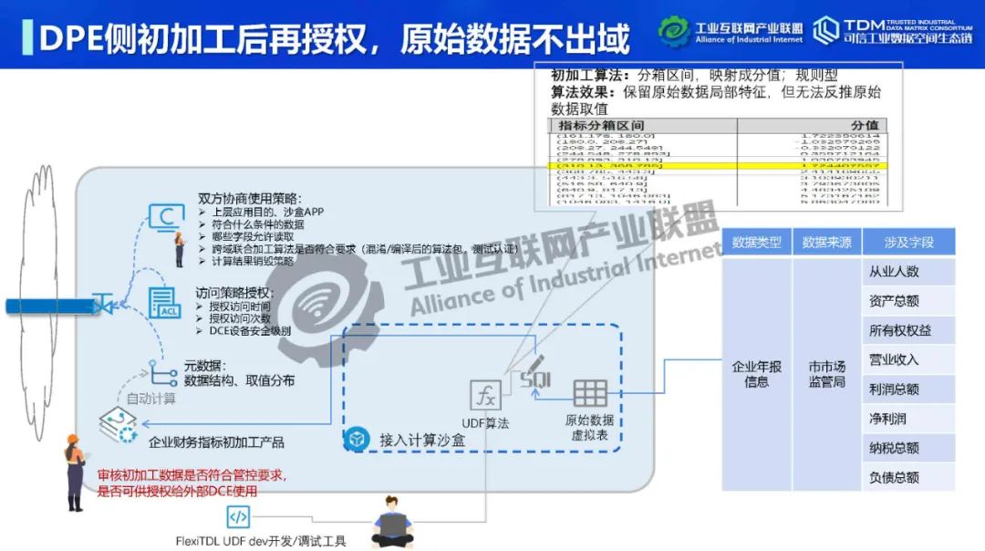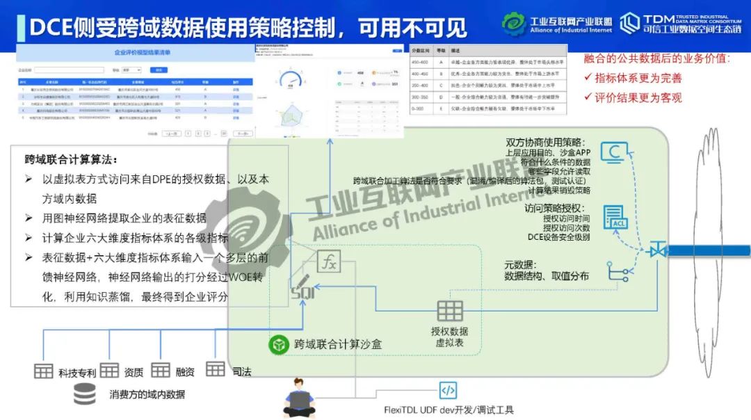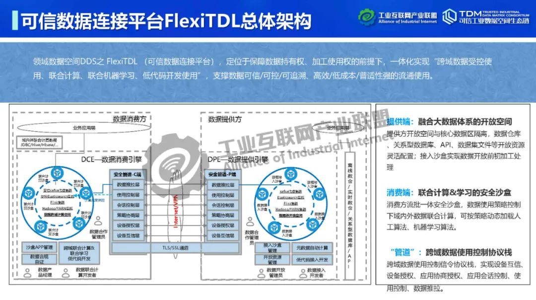 在本次講座中,深圳數鑫科技有限公司創始人&CEO吳會才詳細介紹了可信數據空間跨域使用控制技術。他指出,可信數據空間的跨域使用控制功能可實現數據“用后即焚”,保障數據持有權,實現數據在跨主體流通中持有權與加工使用權分離。吳會才以可信數據連接平臺FlexiTDL實例介紹了跨域使用控制的實現方式。可信數據連接平臺由DPE(數據提供引擎)和DCE(數據消費引擎)通過TLS/SSL安全通道連接組成。數據提供和使用雙方在數據流通前確定數據使用策略,即如何使用數據。DPE采用數據沙盒模式,將提供方開放空間與核心數據區隔離,為數據倉庫、關系型數據庫、API、數據集文件等開放數據資源提供靈活的接入,可在數據沙盒中實現數據開放前初加工處理,如數據脫敏。DCE為消費方提供流批一體安全沙盒,在數據使用策略控制下進行域內外數據聯合計算,在使用策略管控下動態加載人工算法、機器學習算法。DCE在數據按使用策略完成使用后,將原始數據刪除,實現跨域使用控制,即“用后即焚”。