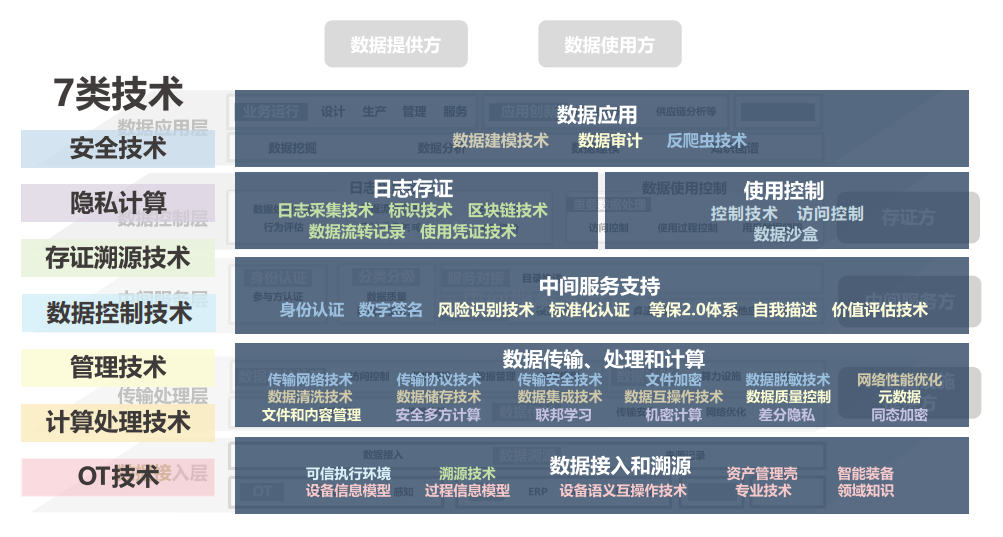 間的實現(xiàn)主要需要以下七大類技術(shù),包括安全技術(shù)、隱私計算技術(shù)、存證溯源技術(shù)、數(shù)據(jù)控制技術(shù)、管理技術(shù)、