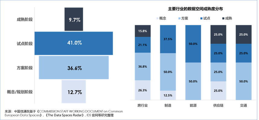歐盟將數(shù)據(jù)空間應(yīng)用成熟度分為四級,目前項目多處于方案和試點階段,尚未進(jìn)入成熟期。從行業(yè)分布上,交通、供應(yīng)鏈、跨行業(yè)的數(shù)據(jù)空間相對進(jìn)展較快,制造和能源行業(yè)也已經(jīng)儲備一批進(jìn)入方案和試點階段的項目。
