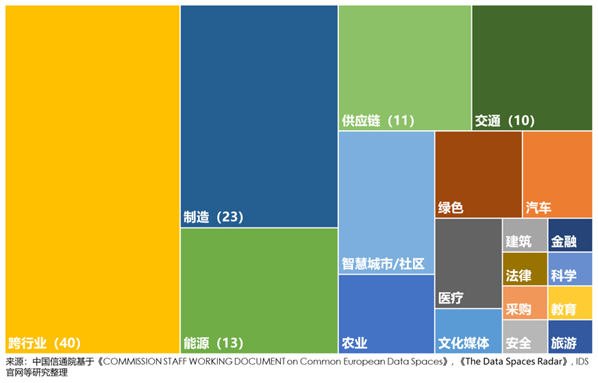 歐盟數(shù)據(jù)空間建設(shè)覆蓋行業(yè)領(lǐng)域不斷擴(kuò)展,其中跨行業(yè)、制造、能源、供應(yīng)鏈、交通的數(shù)據(jù)空間數(shù)量較多。