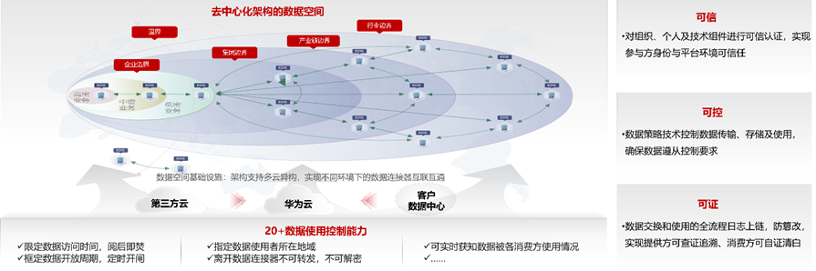 數(shù)據(jù)空間作為目前為止解決數(shù)據(jù)可信流通最合適的解決方案之一,結(jié)合華為實踐,可以將其理解為實現(xiàn)數(shù)據(jù)跨主體,跨邊界流通的“可信、可控、可證”的解決方案: