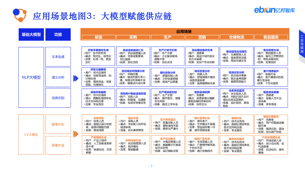 技術(shù)賦能圖示例:億邦智庫梳理的大模型賦能供應(yīng)鏈的應(yīng)用場(chǎng)景地圖以大模型技術(shù)和供應(yīng)鏈環(huán)節(jié)兩個(gè)維度展開,助力大模型供應(yīng)商向鏈主企業(yè)、或供應(yīng)鏈平臺(tái)等,一圖展示全景服務(wù)能力,客戶方一圖通覽全局,按圖選擇切入點(diǎn)。