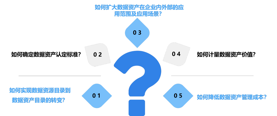 在數據資源化階段,企業普遍搭建了大數據平臺,實現了數據的匯聚,建立了數據資源目錄。但是,在邁入數據資產化階段仍面臨五個主要問題。
