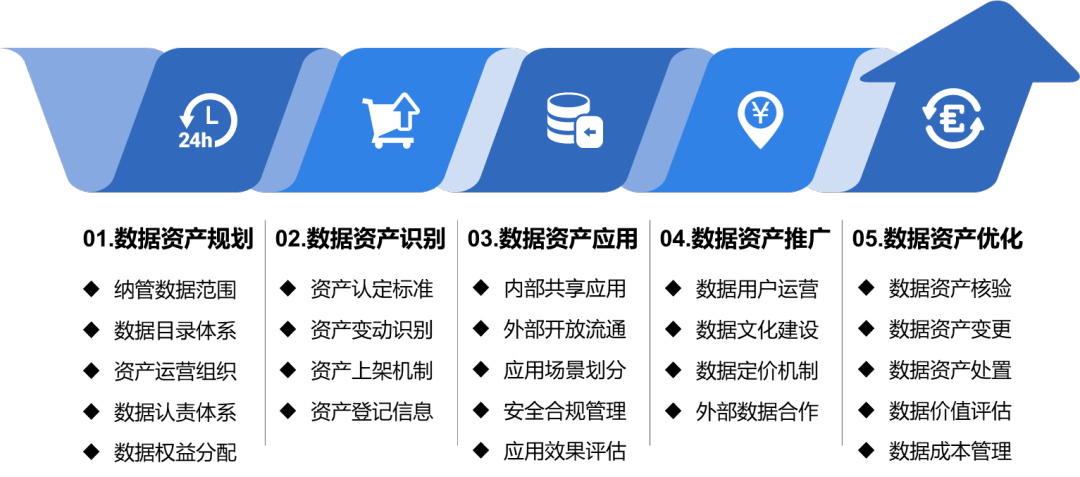 通過調研和評估觀察,我們總結出數據資產全運營“五步法”:數據資產規劃、數據資產識別、數據資產應用、數據資產推廣、數據資產優化。