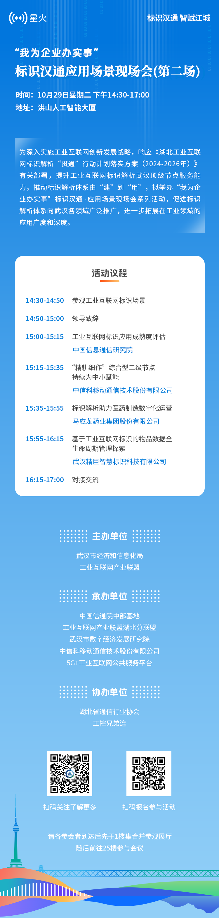 為進一步提升工業互聯網標識解析武漢頂級節點服務能力,推動標識解析體系由“建”到“用”,武漢市經濟和信息化局、工業互聯網產業聯盟聯合舉辦“我為企業辦實事”標識漢通·應用場景現場會系列活動,旨在促進標識解析體系向武漢各領域廣泛推廣,進一步拓展在工業領域的應用廣度和深度。