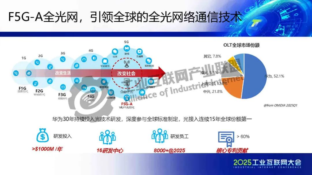 5月22日,在2025工業(yè)互聯(lián)網(wǎng)大會(huì)“工業(yè)數(shù)字化綠色化協(xié)同轉(zhuǎn)型專題活動(dòng)”上,華為技術(shù)有限公司政企光接入總監(jiān)龔奎發(fā)表了《F5G-A全光助力新型工業(yè)綠色高質(zhì)發(fā)展》的主題演講。