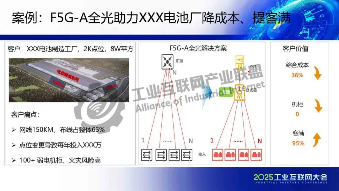 龔奎介紹,在工業(yè)園區(qū)網(wǎng)絡(luò)建設(shè)中,光進(jìn)銅退是大趨勢(shì),F(xiàn)5G-A全光園區(qū)方案因光纖介質(zhì)易獲取、無(wú)源傳輸?shù)葍?yōu)勢(shì),可實(shí)現(xiàn)綠色節(jié)能,且能更好滿足AI應(yīng)用對(duì)大帶寬、低時(shí)延的要求。國(guó)家政策也支持PON技術(shù)在園區(qū)應(yīng)用。華為的F5G-A園區(qū)網(wǎng)絡(luò)解決方案,具有綠色、高質(zhì)、易演進(jìn)特點(diǎn),采用光纖到機(jī)器、無(wú)源分光器等技術(shù),可節(jié)省部件成本80%以上,減少弱電機(jī)柜需求,還具備長(zhǎng)生命周期、強(qiáng)抗干擾性、相對(duì)無(wú)限帶寬等優(yōu)勢(shì),能適應(yīng)技術(shù)快速演進(jìn)。如某電池工廠應(yīng)用后,綜合造價(jià)成本降低30%以上,客戶滿意度提升。目前,已聯(lián)合各方發(fā)布F5G-A在工業(yè)園區(qū)的標(biāo)準(zhǔn),推動(dòng)產(chǎn)業(yè)發(fā)展。
