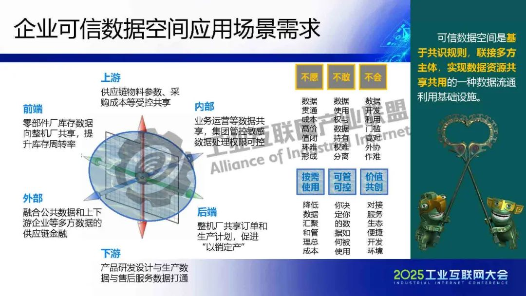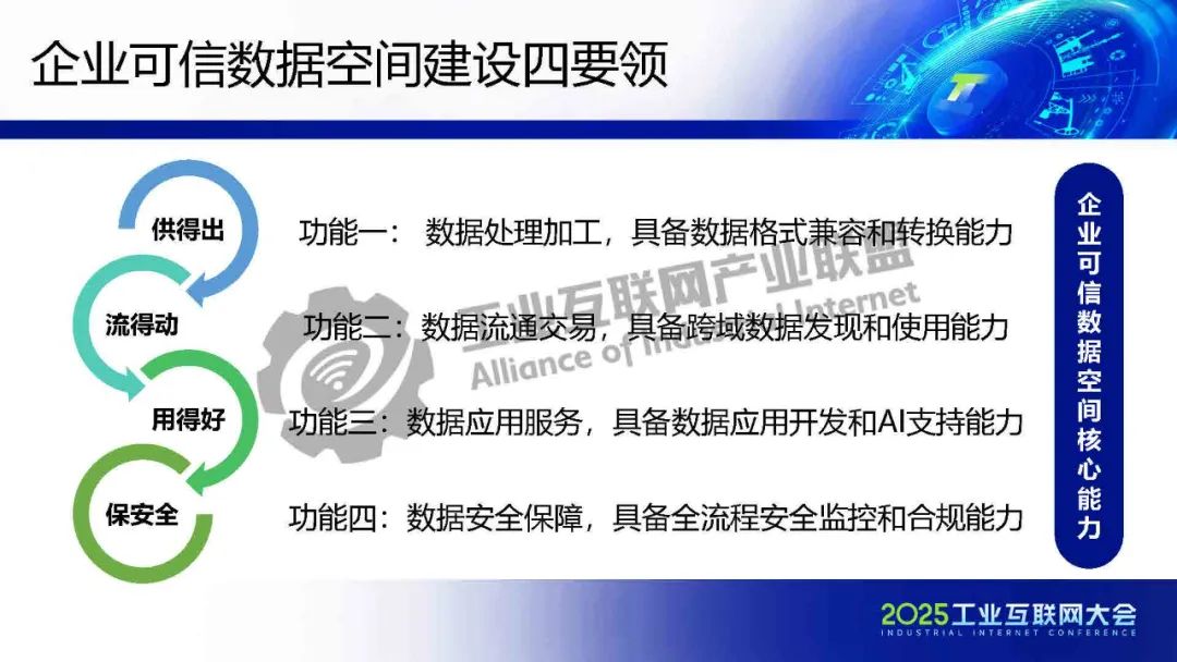 唐博介紹,智能制造企業通過建設可信數據空間,帶領產業鏈上下游共同接入數據流通,為“AI+”時代企業數據資源規模化開發利用,為促進產業鏈供應鏈協同提供了新思路和新模式。唐博提出制造企業數據資源的三大特征、企業可信數據空間建設的四項要領以及工業可信數據空間運營的五個關注點,分享了實體企業在可信數據空間建設和運營方面的實踐經驗,指出了可信數據空間系統解決方案的未來發展方向。