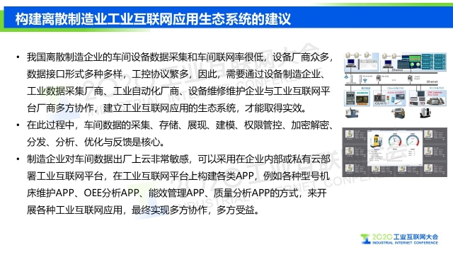 “談到工業互聯網應用,非常重要的一點是生態系統的構建,尤其是針對離散制造業。在這里也提出一個倡議,我國離散制造業的車間設備數據采集率和聯網率很低,設備廠商眾多,設備接口形式眾多,工控協議眾多,因此我們需要通過設備制造企業、工業數據采集廠商、工業自動化廠商、設備維修企業和工業互聯網平臺廠商多方協作,來建立工業互聯網應用的生態系統,才能取得實效。”