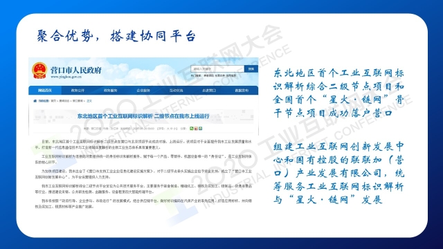 8月30日下午,在2020工業(yè)互聯(lián)網(wǎng)大會(huì)“工業(yè)互聯(lián)網(wǎng)標(biāo)識”主題論壇上,營口市市委副書記、營口市政府黨組書記、市長許桂清以《探索“鏈網(wǎng)協(xié)同”加快全面振興》為題演講,分享了工業(yè)互聯(lián)網(wǎng)+區(qū)塊鏈在營口產(chǎn)業(yè)轉(zhuǎn)型升級中的探索和應(yīng)用,以及持續(xù)深化“鏈網(wǎng)協(xié)同”,推動(dòng)全產(chǎn)業(yè)鏈提質(zhì)增效升級,提速振興發(fā)展的未來規(guī)劃。