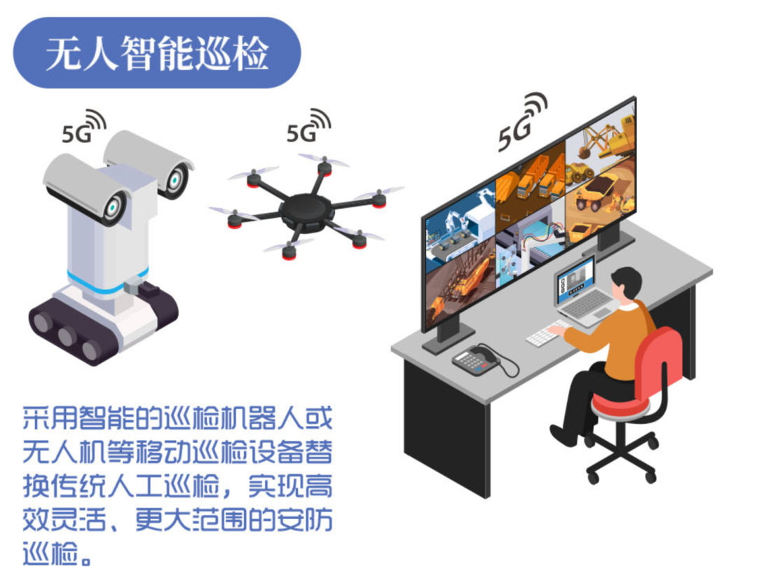 通過內置 5G 模組或部署5G網關等設備,實現巡檢機器人或無人機等移動化、智能化安防設備的5G網絡接入,替代巡檢人員進行巡邏值守,采集現場視頻、語音、圖片等各項數據,自動完成檢測、巡航以及記錄數據、遠程告警確認等工作;相關數據通過5G 網絡實時回傳至智能巡檢系統,智能巡檢系統利用圖像識別、深度學習等智能技術和算法處理,綜合判斷得出巡檢結果,有效提升安全等級、巡檢效率及安防效果。