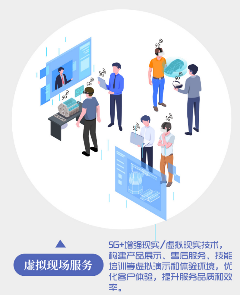 虛擬現(xiàn)場服務(wù)主要包括產(chǎn)品展示體驗、輔助技能學習、遠程運維指導等三類服務(wù)。產(chǎn)品展示體驗服務(wù)通過對工業(yè)產(chǎn)品的外型數(shù)據(jù)及內(nèi)部結(jié)構(gòu)進行立體化建模,構(gòu)建虛擬數(shù)字展廳,通過5G網(wǎng)絡(luò)傳輸至平板電腦、增強現(xiàn)實/虛擬現(xiàn)實(AR/VR)眼鏡等智能終端,與數(shù)字模型實時互動,實現(xiàn)產(chǎn)品細節(jié)的沉浸式體驗和感受。輔助技能學習服務(wù)基于5G和AR/VR融合構(gòu)建貼近真實場景的全虛擬場景,進行操作技能培訓和自由操作練習,提高技能學習效率。遠程運維指導服務(wù)通過在全虛擬場景中,疊加遠端專家指導數(shù)據(jù)形成端云協(xié)同,使端側(cè)獲得實時操作指導,提升運維服務(wù)的效率和質(zhì)量。
