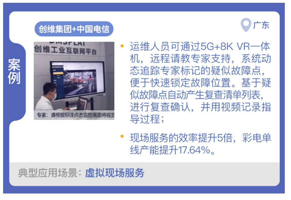 深圳創(chuàng)維-RGB電子集團有限公司與中國電信合作,開展了“5G+8K柔性智能工廠”項目建設(shè),實現(xiàn)了虛擬現(xiàn)場服務(wù)場景的應(yīng)用。利用自主研發(fā)的創(chuàng)維8K VR一體機設(shè)備和5G完美融合,形成“云管端”的整體解決方案。遇到問題時,現(xiàn)場運維人員佩戴創(chuàng)維8K VR一體機,根據(jù)系統(tǒng)投射到視野前方的信息獲得可視化指導幫助。信息輔助無法解決問題時,打開遠程專家支持,專家以第一視角畫面清晰獲知現(xiàn)場情況,用紅框標記疑似故障點,實時反饋至VR眼鏡。系統(tǒng)能夠?qū)σ伤乒收宵c進行動態(tài)跟蹤,方便運維人員快速鎖定故障位置。通過記錄疑似故障點,自動產(chǎn)生復查清單列表,實現(xiàn)對維修過程關(guān)鍵點復查確認。同時,每次遠程指導都以視頻形式進行記錄,用于案例分析或教學使用。通過應(yīng)用該技術(shù),創(chuàng)維現(xiàn)場服務(wù)的效率提升了5倍,彩電單線產(chǎn)能提升17.64%,一線質(zhì)檢員工減少40%,出口提升71.25%。